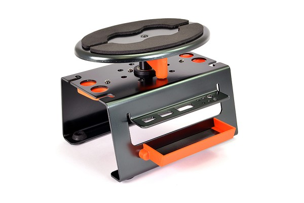 Either side features a shock building station for supporting shocks via shafts or shock bodies. A mounted rotating moulded jig accomodates 11, 13 and 17mm sized shock bodies.