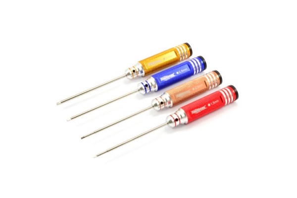 Inexpensive set with aluminium machined and anodised handles. Hard bit. Four metric sizes - 1.5mm, 2mm, 2.5mm and 3mm.